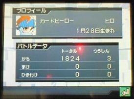 × [PR]上記の広告は3ヶ月以上新規記事投稿のないブログに表示されています。新しい記事を書く事で広告が消えます。 実家~下宿先の間を移動する際に よくDS版カードヒーローをプレイしていたのですが、先日 ようやく「トーナメント50回制覇」と「絵柄違いを除くカード全種 各9枚集め」を達成しました。 ・全150種類 × 9枚 = 1350枚 ・絵柄違い 35種類 × 1枚 + 1枚(ジャレット) = 36枚 ★計1386枚★ 長かったー。ここまでホント長かったー! スパルタス覚醒を9枚揃えるだけで 9000pt × 9枚 = 81000pt ですよ! トーナメントで稼いだptがあっという間に消える消える・・・。 「トーナメント50回制覇」の目標が無ければ途中で挫折していただろうなぁ。 トーナメントは50回制覇後も再びプレイしたのですが、 クリアしてもセリフと称号の変化が無かったので少し残念(´・ω・`) GB版の時からプレイしていますが、やっぱりカードヒーロは面白いなぁ! [GB版]→[実カード版] の際に修正された「先攻ドローの廃止」が DS版で何故復活したのか?等のちょっとした疑問はありましたが、 全体を通して 楽しくプレイすることのできた作品でした。 ハルカかわいいよハルカ。 生まれて初めて本気で怒ってしまう